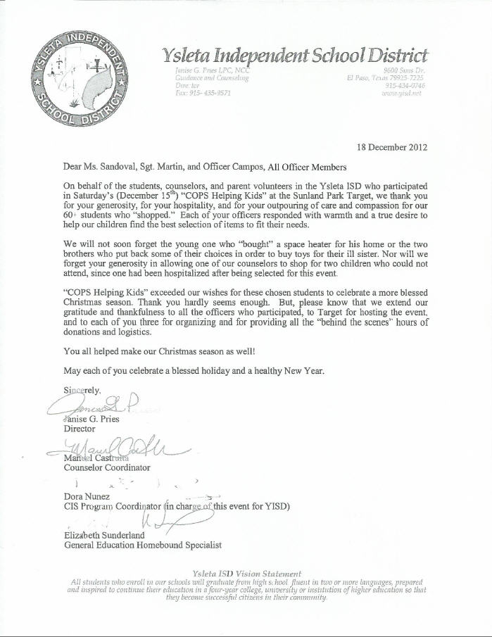 Thank You Letter to Cops Helping Kids Participants