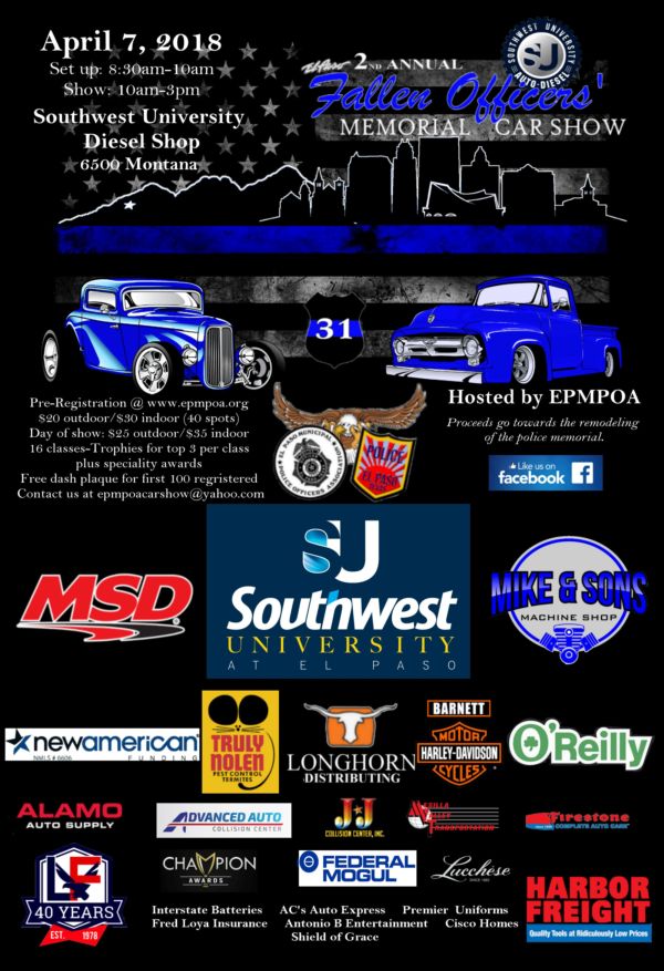Join us for the 2nd Annual EPMPOA Fallen Officers’ Memorial Car Show on Saturday, April 7, 2018, at the Southwest University Diesel Shop located at 6500 Montana Ave. Proceeds will go toward the remodeling of the Police Memorial located at Chuck Heinrich Park.
