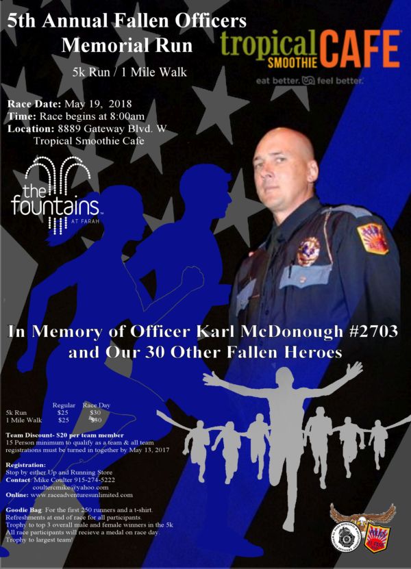 The 5th Annual EPMPOA Fallen Officers Memorial Run will take place on Saturday, May 19, 2018, starting at 8:00 AM. This year the race will start at Tropical Smoothie Cafe, 8889 Gateway West Blvd. at the Fountains at Farah. This year's race is in memory of Officer Karl McDonough #2703 and our other fallen heroes.