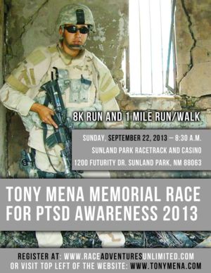 The El Paso Municipal Police Officers’ Association urges its members and their families to participate in the annual Tony Mena Memorial Race for PTSD Awarness. The 1-Mile Walk/Run and an 8K Run, will take place on Sunday, September 22, 2013, starting at 8:30 AM at Sunland Park Racetrack and Casino, 1200 Futurity Dr., in Sunland Park, New Mexico.